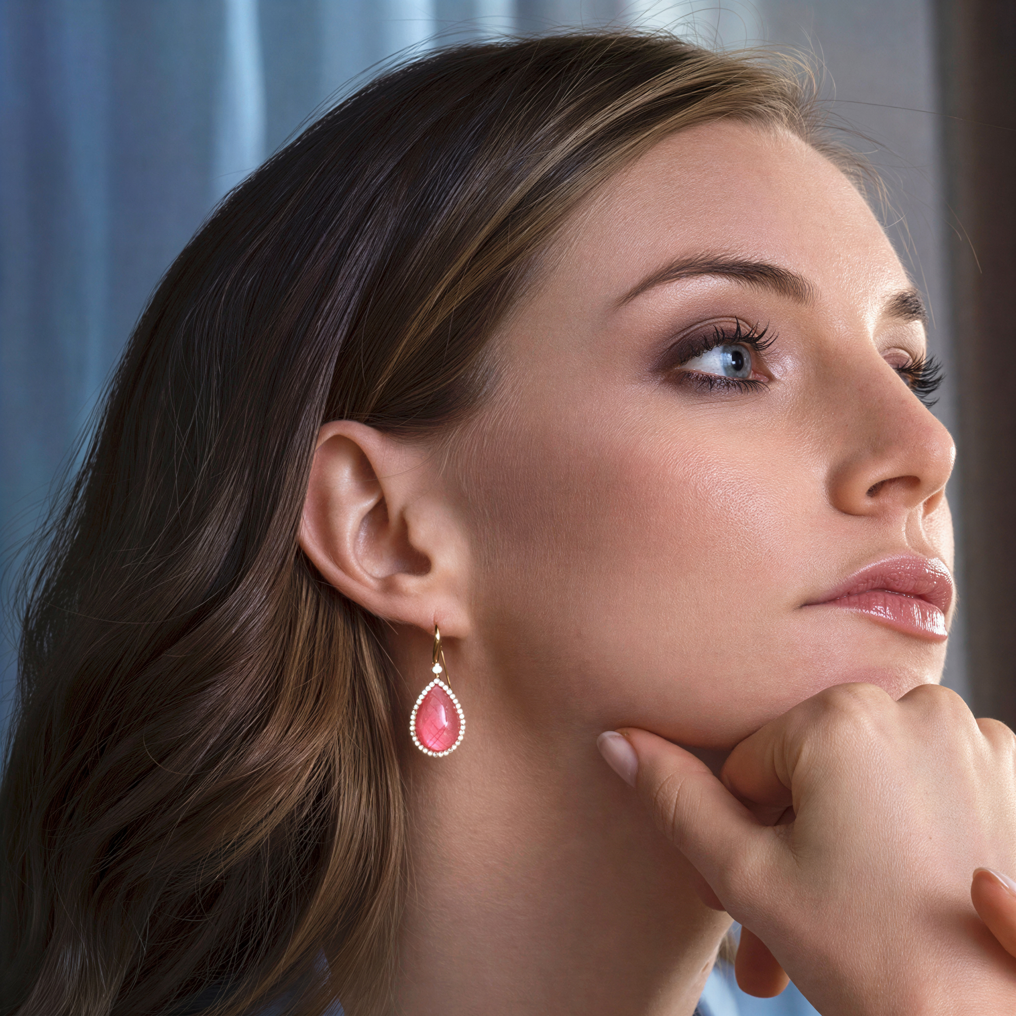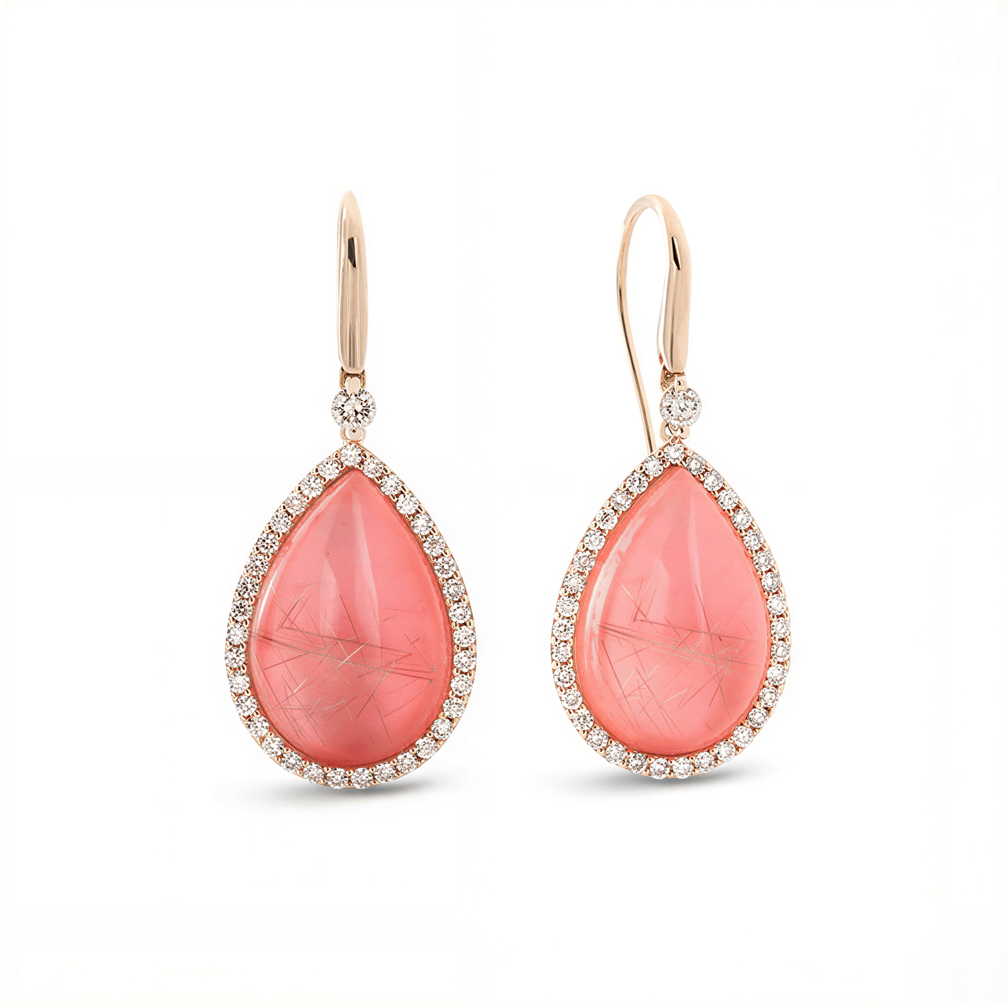 Cocktail earring in 18kt rose gold, rutilated quartz, pink agate, white mother of pearl and brown diamonds.