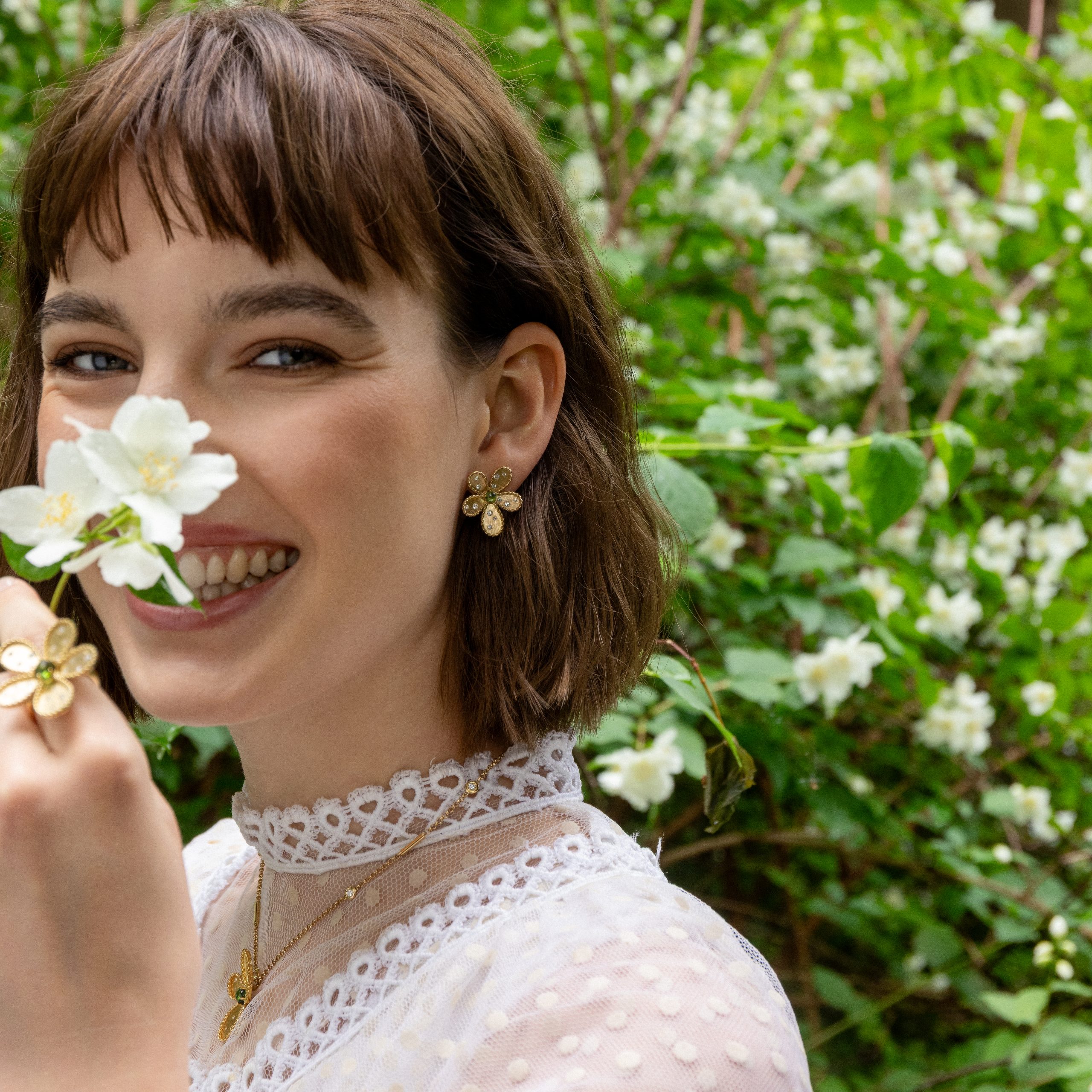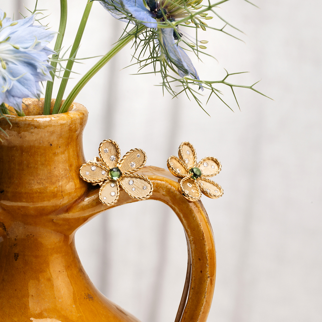 Jasmine earrings in 18kt yellow gold, green tourmaline and diamods.