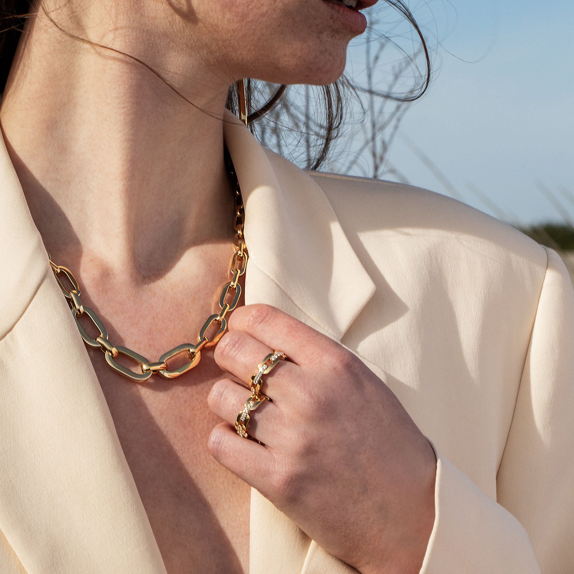 Navarra chain link ring in 18kt yellow gold with diamonds.
