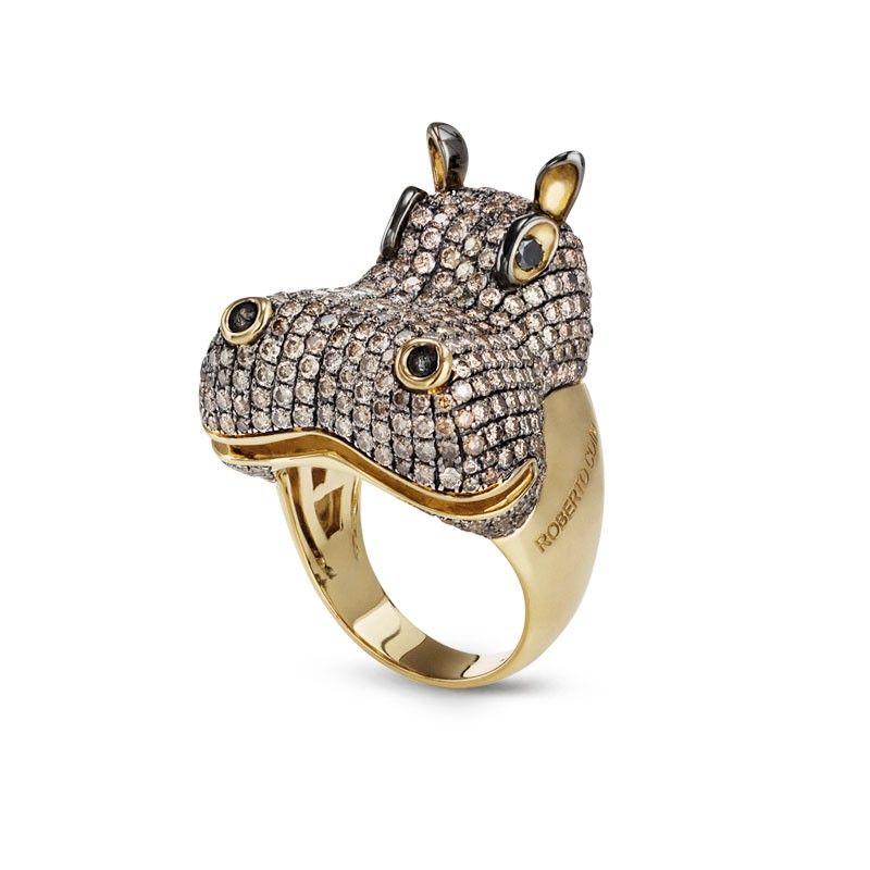+ Free ShippingHippo ring in 18k yellow and burnished gold, with black and brown diamonds.
