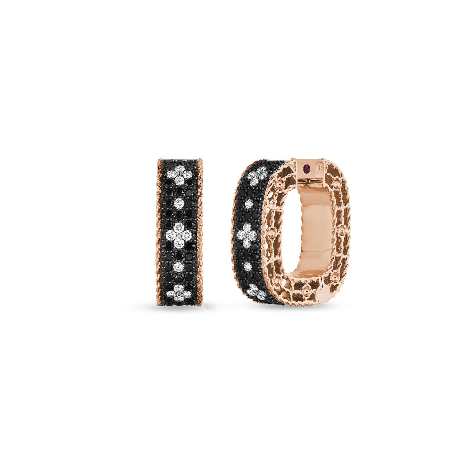 Black and white diamonds decorate these lovely earrings by Roberto Coin, featuring 18 kt rose gold and the uniqueness of an handmade jewel.